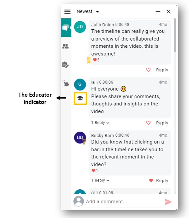 Every comment (or reply) provided by the instructors is marked with the Educator indicator (the graduation hat beneath the user image). Learners' comments do not have this icon.